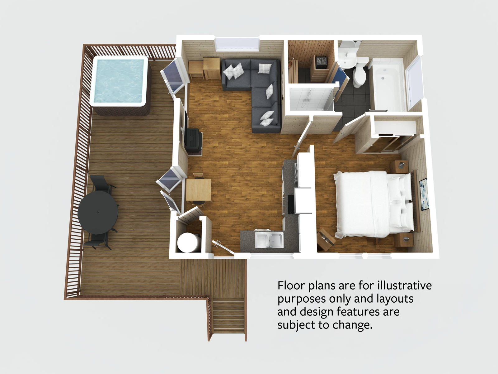 The contemporary and luxurious Kedleston Elite Vogue lodges provide spacious and light living accommodation thanks to the open plan living space, wooden floors and natural light provided by the full length windows and patio doors leading onto the decking with outdoor dining furniture and hot tub. The living area has a dining table, comfy sofa and a TV with Chromecast for streaming. The lodges are very well equipped with modern appliances, contemporary fixtures, comfortable furnishings and provide superb accommodation. The lodge has a king size bed with flat screen TV. The luxurious ensuite includes a spa bath and separate shower cubicle and a sauna. Two bathrobes are provided. The kitchen includes a wide range of cooking utensils, a fridge with freezer compartment and dishwasher. These lodges are ideal for couples looking for a romantic break. Some of these lodges accept pets. If you have an allergy please ensure you book a pet free lodge. Please choose the Kedleston Elite 1 'Spa' if you would like a hot tub on the veranda. Free Wi-Fi.