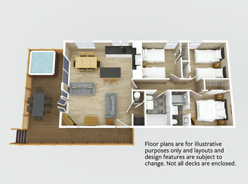 The contemporary and luxurious Elite Vogue lodges provide light and spacious living accommodation thanks to the open plan living space, wooden floors and natural light provided by the full length windows. Patio doors lead onto the decking with outdoor dining furniture and an indulgent outdoor hot tub. The lodges are very well equipped with modern appliances, contemporary fixtures, comfortable furnishings and provide superb accommodation. The living area includes a dining table, comfy sofas and a TV with Chromecast for streaming. The kitchen includes a fridge freezer, dishwasher and washing machine. The lodge has a master bedroom with one double bed, flat screen TV and ensuite shower. Two bathrobes are provided. This lodge has two further twin bedrooms and a family bathroom with overhead shower. Free wi-fi.